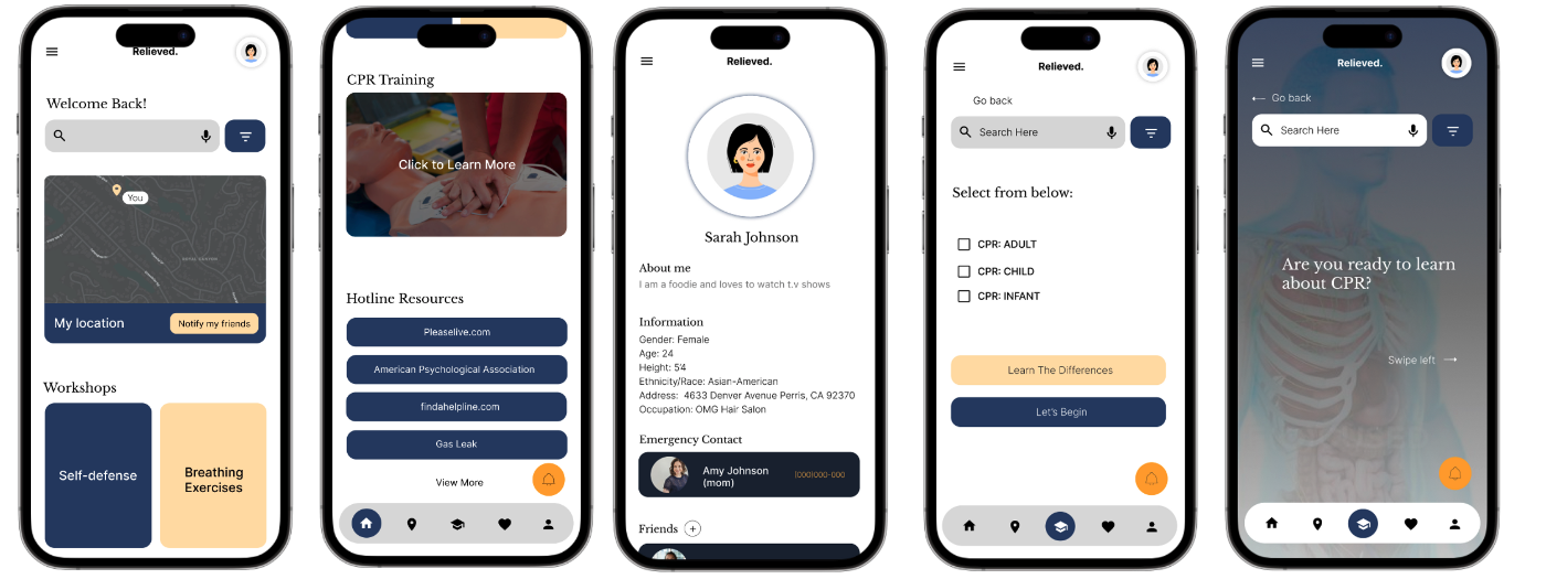 Relieved is a 24/7 safety app that entails immediate 911 calls, self-defense workshop videos, CPR courses, CPR classes near individuals, location tracker and history, and hotline resources.