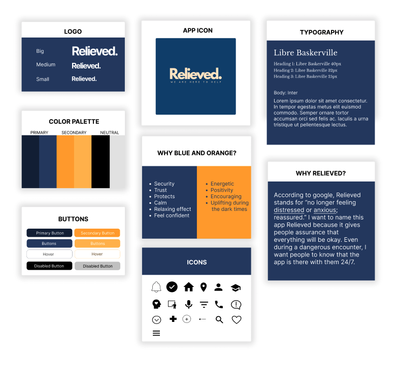 I created a UI kit intended to give security and assurance. When creating a color palette for Relieved, I want the colors to resonate with the name Relieved. Therefore, I came to the conclusion to use blue and orange. I included typographic hierarchy, button formats, sizes, states, and variants, form elements, providing greater detail on grids, and establishing an approach for iconography.